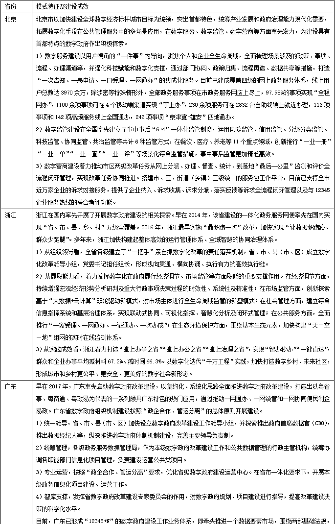 發(fā)展基礎(chǔ):經(jīng)濟社會發(fā)展水平較高,數(shù)字政府建設(shè)謀劃布局和起步建設(shè)較早,在政府履職、平臺支撐、數(shù)據(jù)開放等方面較早進行了探索,在組織機構(gòu)、體制機制、治理方式等方面較早取得了部分示范性成效。