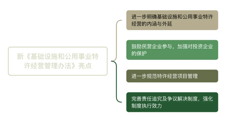 《基礎(chǔ)設(shè)施和公用事業(yè)特許經(jīng)營(yíng)管理辦法》的發(fā)布與適用,規(guī)范了基礎(chǔ)設(shè)施和公用事業(yè)特許經(jīng)營(yíng)項(xiàng)目的經(jīng)營(yíng)與管理,增加利好規(guī)定,鼓勵(lì)民營(yíng)企業(yè)參與基礎(chǔ)設(shè)施和公用事業(yè)特許經(jīng)營(yíng)項(xiàng)目,完善了政府和社會(huì)資本合作新機(jī)制,為基礎(chǔ)設(shè)施和公用事業(yè)特許經(jīng)營(yíng)項(xiàng)目提供了更加完善、明確的指引,具有較大進(jìn)步意義。