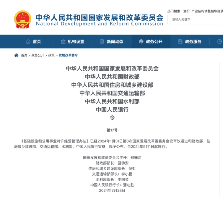 《基礎(chǔ)設(shè)施和公用事業(yè)特許經(jīng)營(yíng)管理辦法》(以下簡(jiǎn)稱“《辦法》”)已經(jīng)2024年1月31日第8次國(guó)家發(fā)展改革委委務(wù)會(huì)議審議通過(guò)和財(cái)政部、住房城鄉(xiāng)建設(shè)部、交通運(yùn)輸部、水利部、中國(guó)人民銀行審簽,自2024年5月1日起施行。原《基礎(chǔ)設(shè)施和公用事業(yè)特許經(jīng)營(yíng)管理辦法》(國(guó)家發(fā)展改革委等6部委2015年第25號(hào)令)同時(shí)廢止。