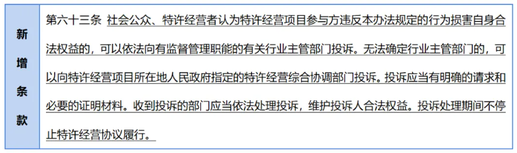 《辦法》于第六十三條中補(bǔ)充了特許經(jīng)營(yíng)項(xiàng)目相關(guān)的投訴處理制度,為社會(huì)公眾、特許經(jīng)營(yíng)者利益的維護(hù)提供了法定的新途徑,進(jìn)一步保障了社會(huì)公眾及特許經(jīng)營(yíng)者的利益。明確可依法向有監(jiān)督管理職能的有關(guān)行業(yè)主管部門投訴,無(wú)法確定行業(yè)主管部門的,可以向特許經(jīng)營(yíng)項(xiàng)目所在地人民政府指定的特許經(jīng)營(yíng)綜合協(xié)調(diào)部門投訴。投訴應(yīng)當(dāng)有明確的請(qǐng)求和必要的證明材料。收到投訴的部門應(yīng)當(dāng)依法處理投訴,維護(hù)投訴人合法權(quán)益。