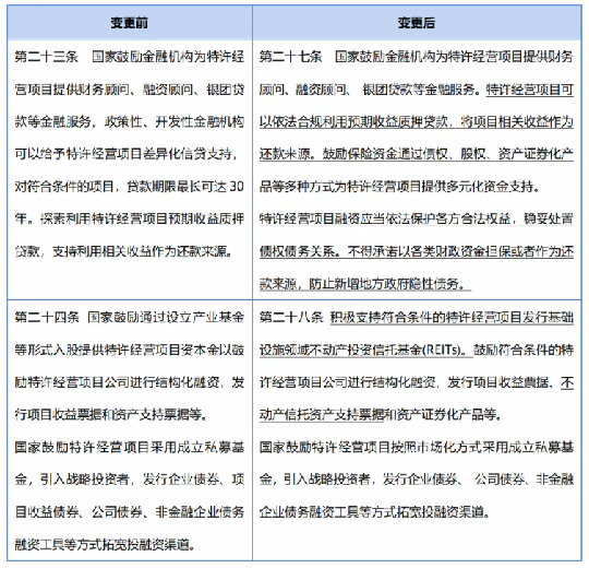 多元化投資融資渠道,支持利用相關(guān)收益作為還款來(lái)源。依據(jù)《辦法》第二十七條及第二十八條,修訂后《辦法》補(bǔ)充特許經(jīng)營(yíng)項(xiàng)目可以依法合規(guī)利用逾期收益質(zhì)押貸款,鼓勵(lì)保險(xiǎn)資金通過(guò)債權(quán)、股權(quán)、資產(chǎn)證券化產(chǎn)品等多種方式為特許經(jīng)營(yíng)項(xiàng)目提供多元化資金支持,積極支持符合條件的特許經(jīng)營(yíng)項(xiàng)目發(fā)行基礎(chǔ)設(shè)施領(lǐng)域不動(dòng)產(chǎn)投資信托基金(REITs),進(jìn)一步擴(kuò)大了特許經(jīng)營(yíng)區(qū)項(xiàng)目的融資方式。此外,《辦法》亦支持利用相關(guān)收益作為還款來(lái)源,一定程度上減輕了投資企業(yè)的還款壓力,有利于鼓勵(lì)民營(yíng)企業(yè)的參與,確保項(xiàng)目的有序開(kāi)展。