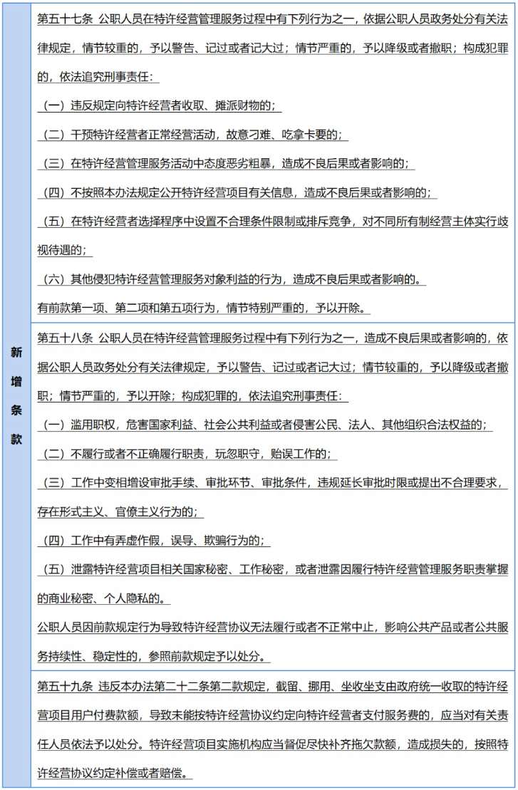明確公職人員在特許經(jīng)營(yíng)管理服務(wù)中的違法行為及責(zé)任承擔(dān)。《辦法》第五十七條、第五十八條明確在公職人員在存在規(guī)定行為的,依據(jù)公職人員政務(wù)處分有關(guān)法律規(guī)定,情節(jié)較重的,予以警告、記過(guò)或者記大過(guò);情節(jié)嚴(yán)重的,予以降級(jí)或者撤職;構(gòu)成犯罪的,依法追究刑事責(zé)任。