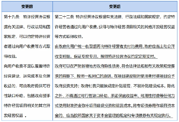 政府主動(dòng)公開(kāi)收支明細(xì),以補(bǔ)貼運(yùn)營(yíng)方式給予投資支持。雖《辦法》中仍明確由政府向用戶收取后再向特許經(jīng)營(yíng)者支付費(fèi)用,本次修訂中明確“政府應(yīng)主動(dòng)公開(kāi)收支明細(xì),保證專款專用,按照特許經(jīng)營(yíng)協(xié)議約定定期支付”,完善支付管理制度,一定程度上加大了信息公開(kāi)程度,確保收支公開(kāi)透明,有利于維護(hù)投資企業(yè)的利益。同時(shí),一定條件下政府可按規(guī)定補(bǔ)貼運(yùn)營(yíng),肯定了用專項(xiàng)債券用作項(xiàng)目資本金的方式。