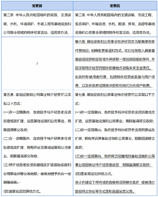 在適用領(lǐng)域方面,限定為“交通運(yùn)輸、市政工程、生態(tài)保護(hù)、環(huán)境治理、水利、能源、體育、旅游等”,在原辦法基礎(chǔ)上補(bǔ)充了體育及旅游領(lǐng)域的適用;在適用項(xiàng)目方面,聚焦于使用者付費(fèi)項(xiàng)目,明確收費(fèi)渠道和方式,具體包括特許經(jīng)營(yíng)者直接向用戶收費(fèi),以及由政府或其依法授權(quán)機(jī)構(gòu)代為向用戶收費(fèi);在特許經(jīng)營(yíng)方式方面,于《辦法》第七條明確列舉,完善原列舉表述方式,禁止提前移交變相逃避運(yùn)營(yíng)義務(wù)。