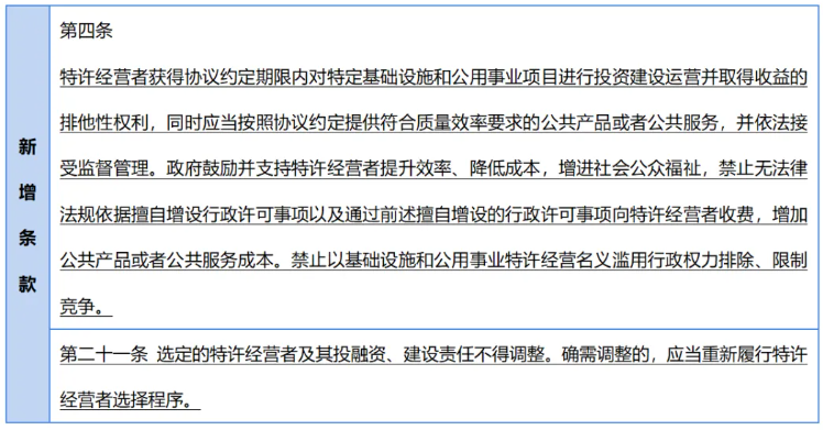 本次修訂中,于《辦法》第一條立法目的中補(bǔ)充“激發(fā)民間投資活力”,于《辦法》第十八條中增加明確,鼓勵(lì)民營(yíng)企業(yè)通過(guò)直接投資或者獨(dú)資、控股、參股等方式積極參與特許經(jīng)營(yíng)項(xiàng)目,根據(jù)、參照國(guó)務(wù)院發(fā)展改革部門制定的支持民營(yíng)企業(yè)參與的新建及改擴(kuò)建特許經(jīng)營(yíng)項(xiàng)目清單,確定民營(yíng)企業(yè)參與的具體方式。