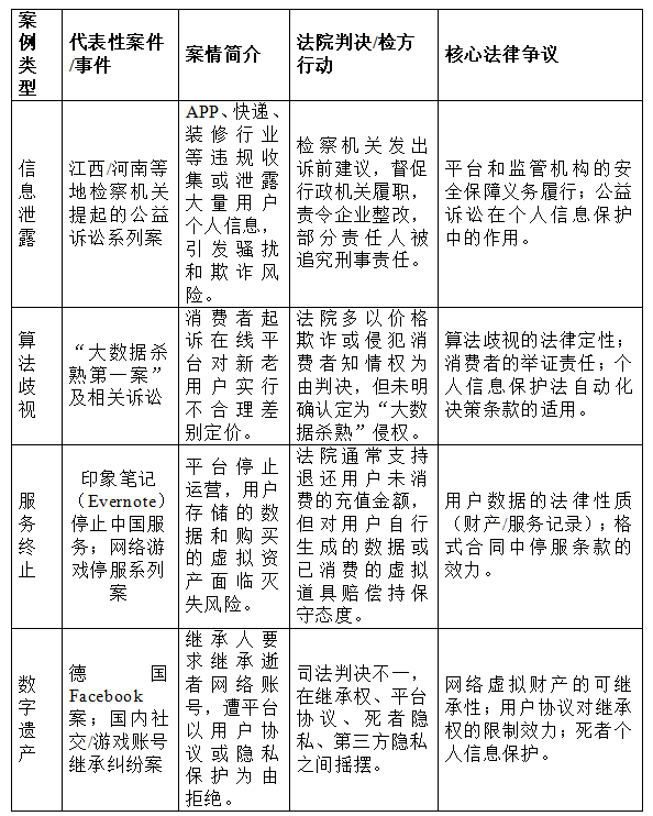 本文立足于司法實踐的視角,對大規(guī)模個人信息處理在我國引發(fā)的系統(tǒng)性法律風險及其治理路徑進行了系統(tǒng)性考察。研究表明,隨著數(shù)字經(jīng)濟的深化,相關風險已超越了傳統(tǒng)的個人隱私侵權范疇,演化為關乎數(shù)據(jù)安全與可用性、權利行使與平臺責任平衡,以及對既有法律概念體系沖擊的三個核心維度。通過對檢察公益訴訟、算法歧視、服務終止和數(shù)字遺產(chǎn)四類典型案例的深度剖析。