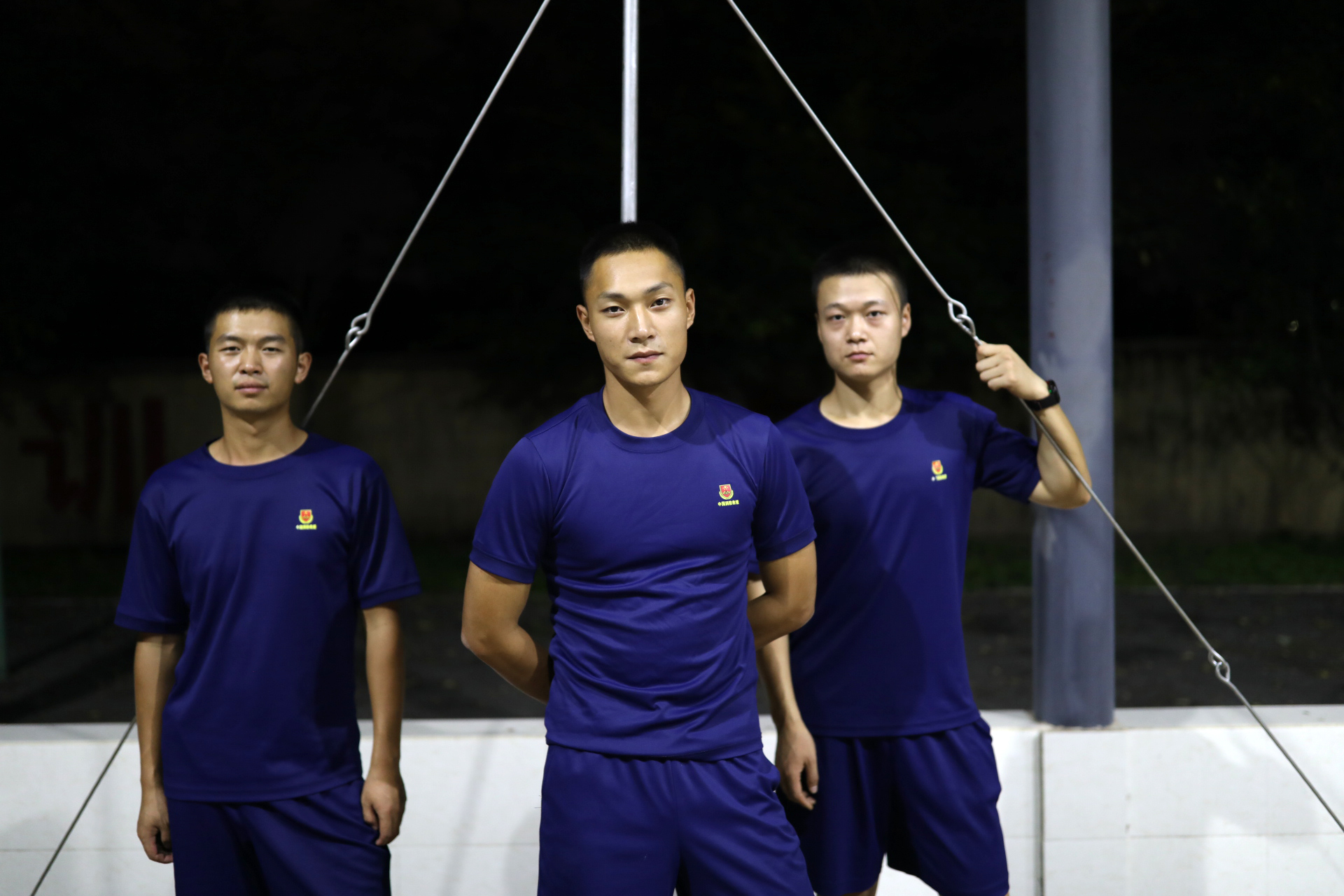新消防員田祥(左)、張益(中)、胡波(右)在成都經(jīng)過(guò)4個(gè)月的訓(xùn)練后,
