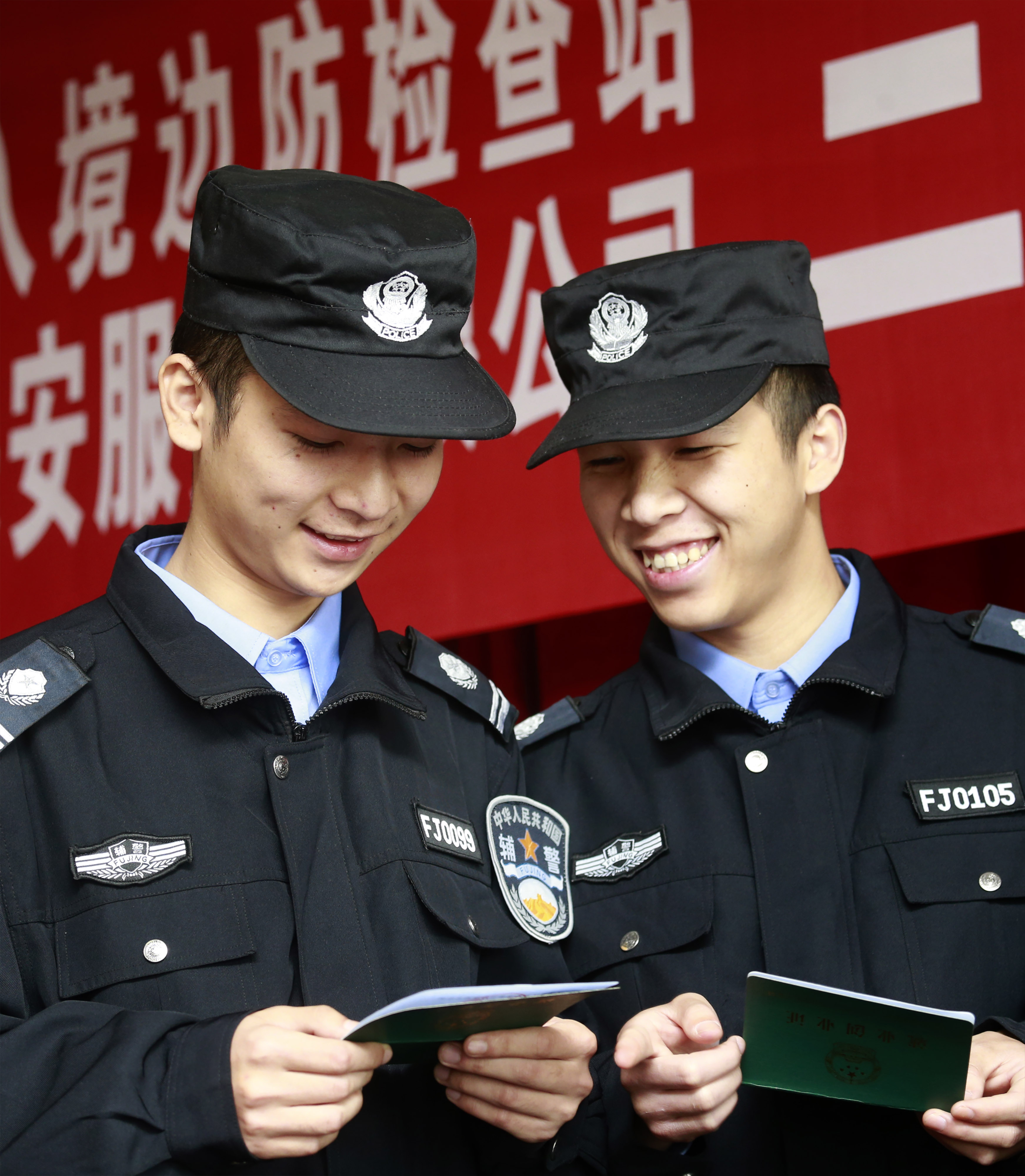 4月27日,南京港出入境邊防檢查站工作人員正在給廣西籍6名輔警佩戴輔警配飾。