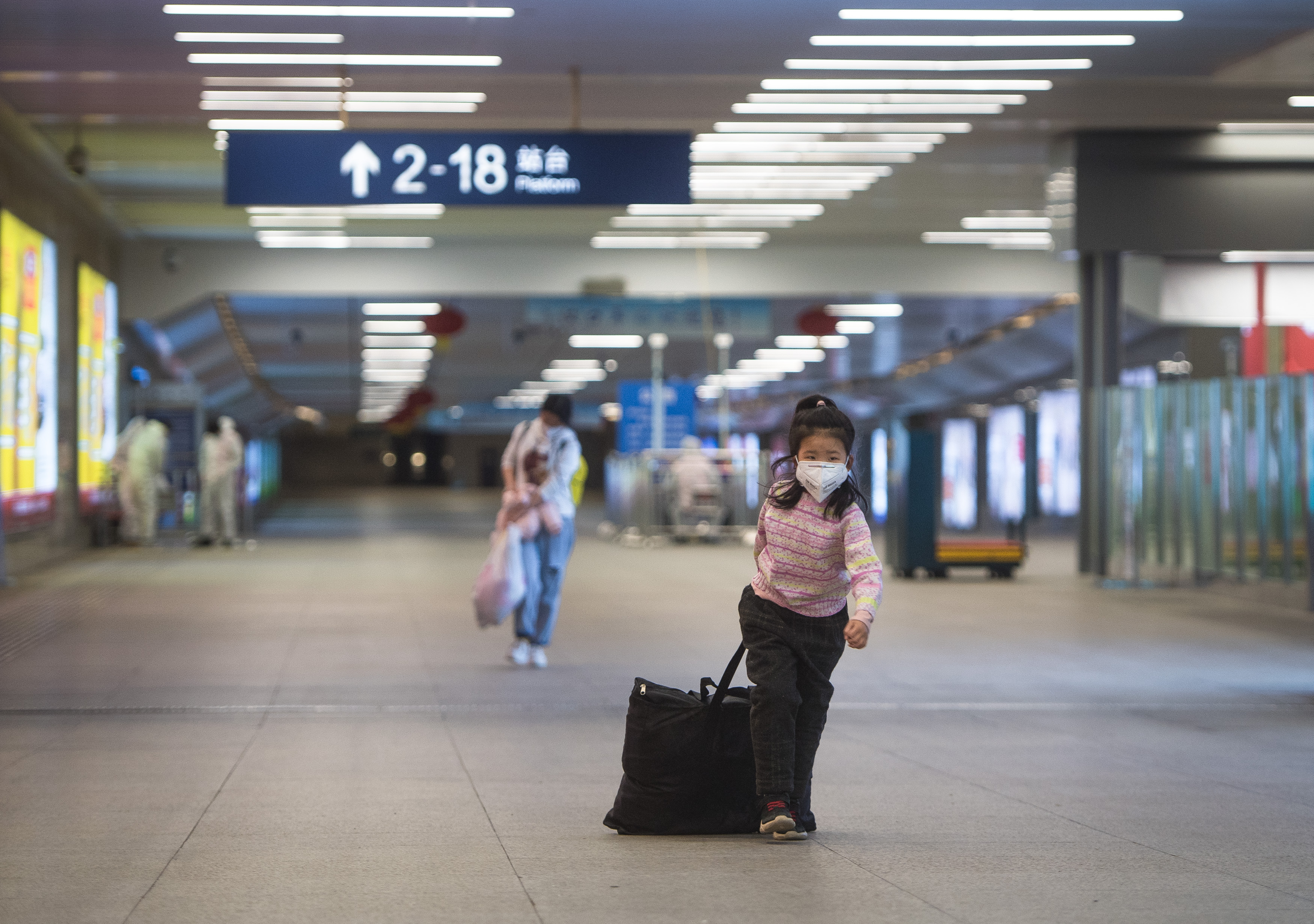 武漢恢復(fù)鐵路客站到達(dá)業(yè)務(wù)當(dāng)天,在武漢漢口火車(chē)站,一名小女孩拉著行李走在家長(zhǎng)的前面(3月28日攝)。