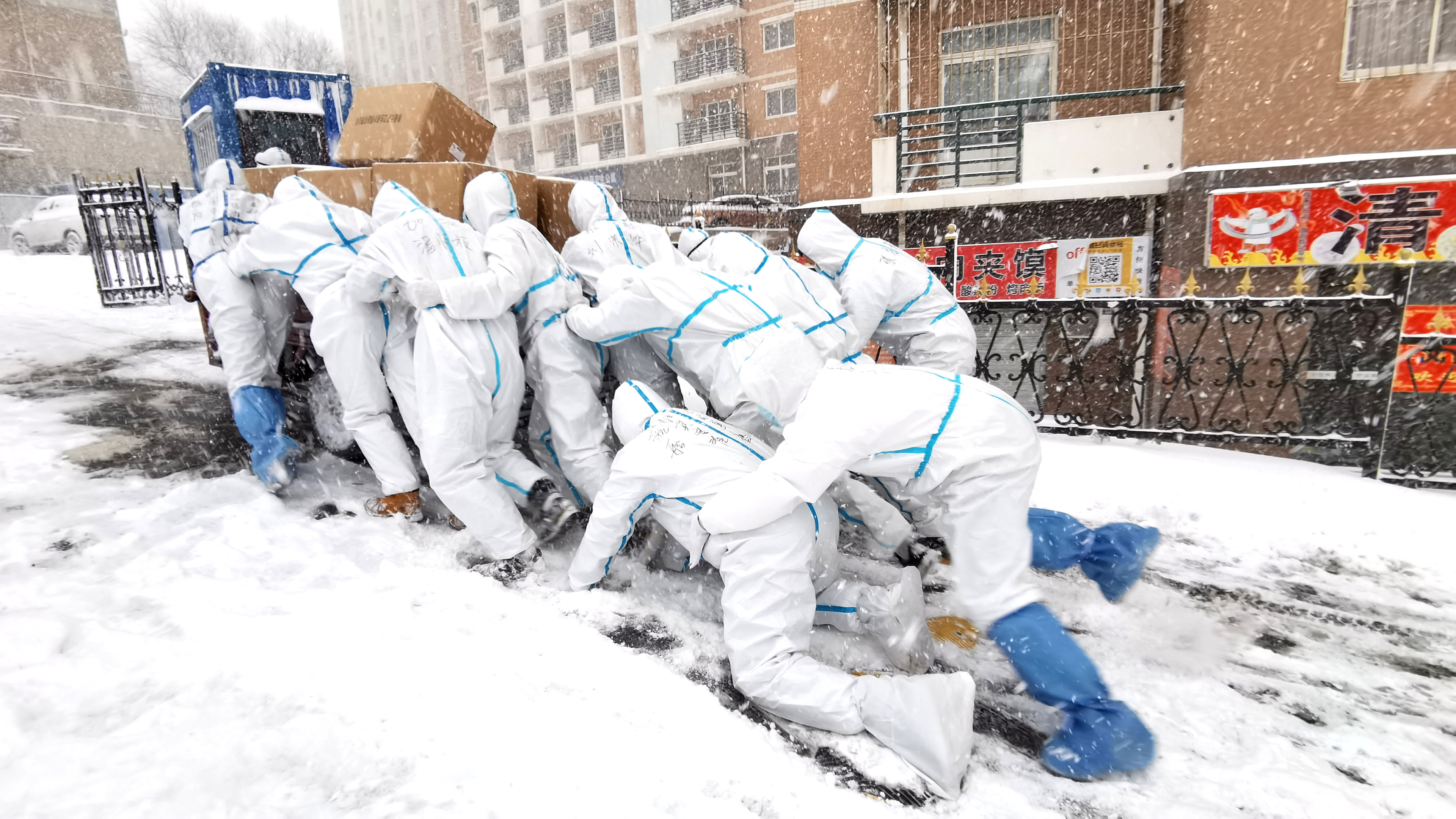 1月6日,大連海洋大學的志愿者們推著滿載的三輪車上坡,將物資送到學生宿舍。