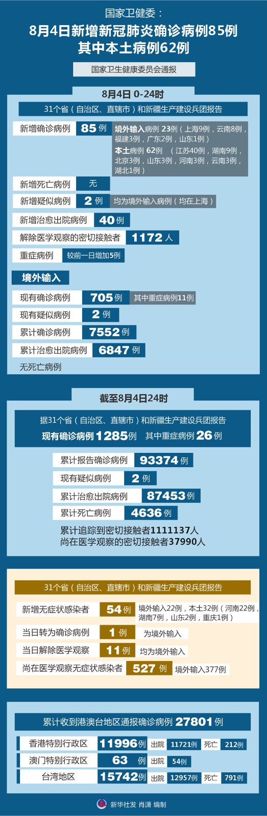 圖表:國(guó)家衛(wèi)健委:8月4日新增新冠肺炎確診病例85例 其中本土病例62例