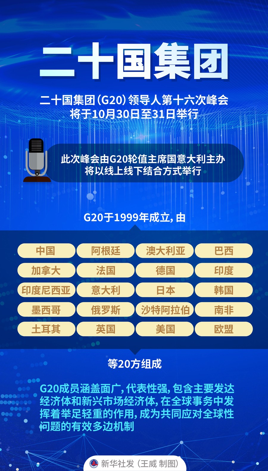 二十國集團(G20)領導人第十六次峰會將于10月30日至31日舉行。此次峰會由G20輪值主席國意大利主辦,將以線上線下結合方式舉行。