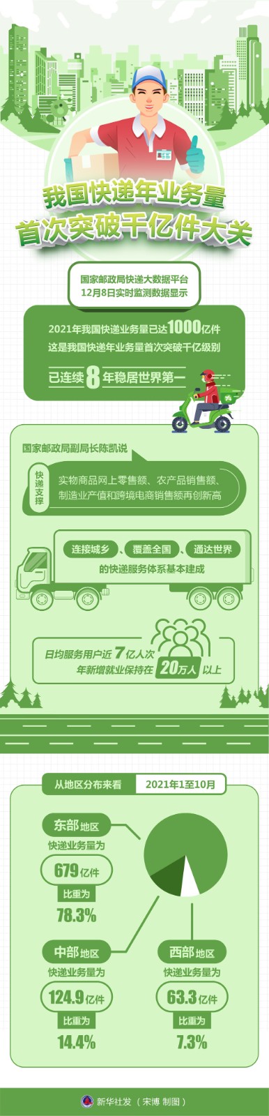 國家郵政局快遞大數(shù)據(jù)平臺12月8日實時監(jiān)測數(shù)據(jù)顯示,2021年我國快遞業(yè)務量已達1000億件,這是我國快遞年業(yè)務量首次突破千億級別,已連續(xù)8年穩(wěn)居世界第一。