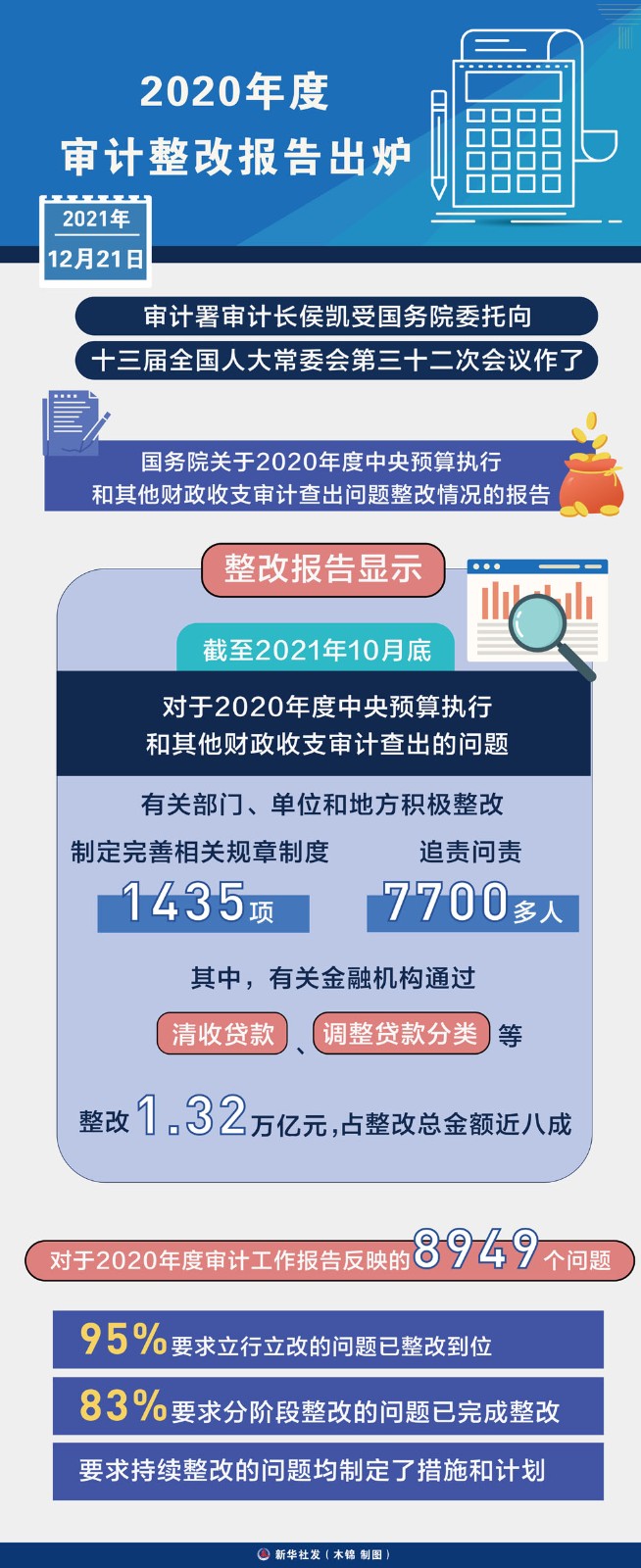 截至2021年10月底,對于2020年度中央預(yù)算執(zhí)行和其他財政收支審計查出的問題,有關(guān)部門、單位和地方積極整改,制定完善相關(guān)規(guī)章制度1435項,追責(zé)問責(zé)7700多人,其中,有關(guān)金融機構(gòu)通過清收貸款、調(diào)整貸款分類等整改1.32萬億元,占整改總金額近八成。