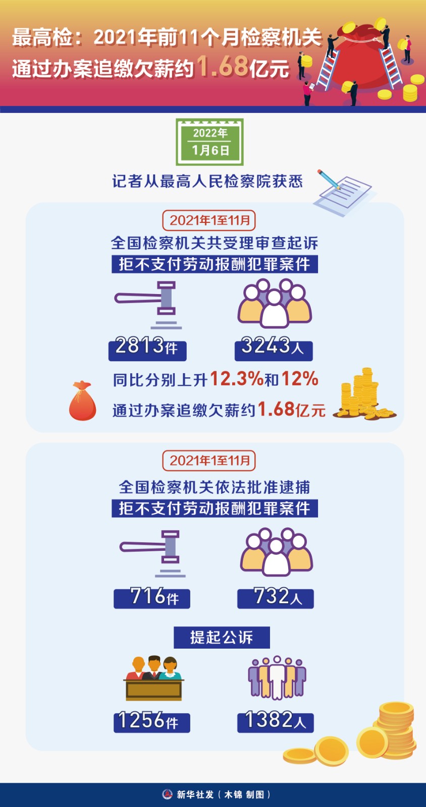 記者1月6日從最高人民檢察院獲悉,2021年1至11月,全國檢察機(jī)關(guān)共受理審查起訴拒不支付勞動(dòng)報(bào)酬犯罪案件2813件3243人,同比分別上升12.3%和12%,通過辦案追繳欠薪約1.68億元。