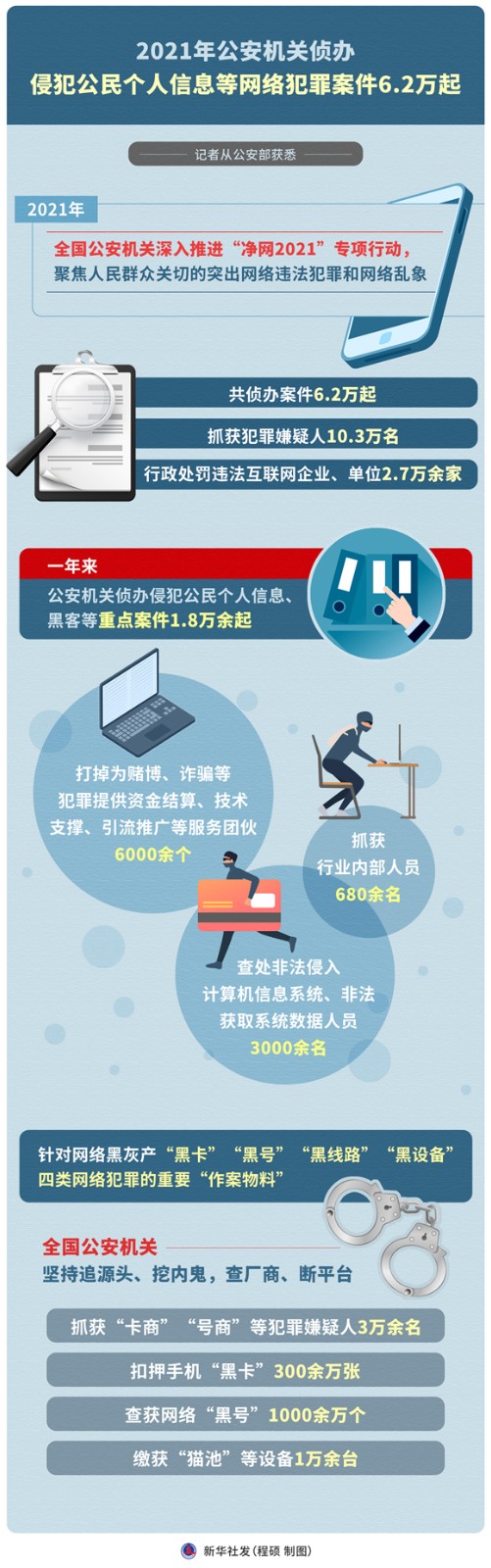 記者從公安部獲悉,2021年,全國公安機(jī)關(guān)深入推進(jìn)“凈網(wǎng)2021”專項(xiàng)行動,聚焦人民群眾關(guān)切的突出網(wǎng)絡(luò)違法犯罪和網(wǎng)絡(luò)亂象,共偵辦案件6.2萬起,抓獲犯罪嫌疑人10.3萬名,行政處罰違法互聯(lián)網(wǎng)企業(yè)、單位2.7萬余家。