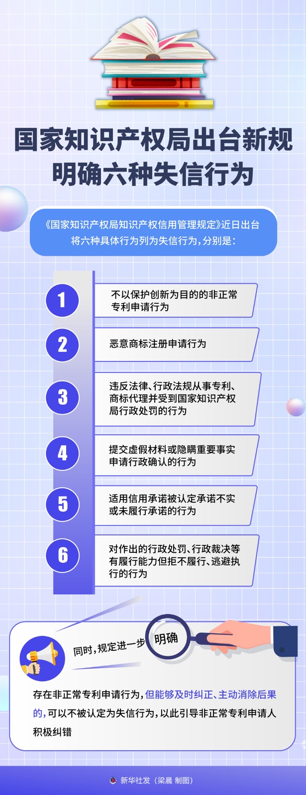 《國家知識產(chǎn)權(quán)局知識產(chǎn)權(quán)信用管理規(guī)定》近日出臺,將六種具體行為列為失信行為,分別是:不以保護創(chuàng)新為目的的非正常專利申請行為,惡意商標注冊申請行為,違反法律、行政法規(guī)從事專利、商標代理并受到國家知識產(chǎn)權(quán)局行政處罰的行為,提交虛假材料或隱瞞重要事實申請行政確認的行為,適用信用承諾被認定承諾不實或未履行承諾的行為,對作出的行政處罰、行政裁決等有履行能力但拒不履行、逃避執(zhí)行的行為。