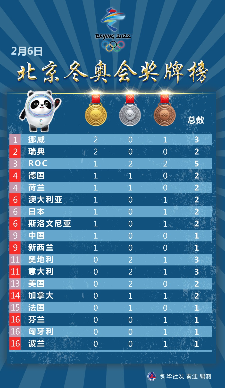圖表:2月6日北京冬奧會獎牌榜