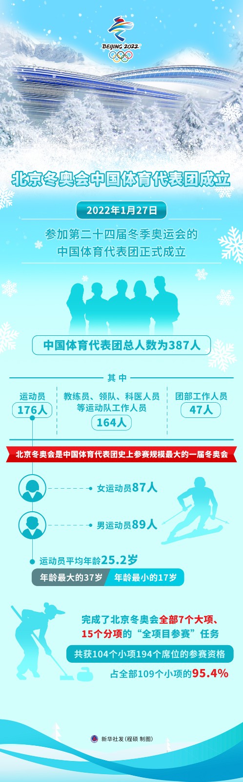 北京冬奧會中國體育代表團總?cè)藬?shù)為387人,其中運動員176人,教練員、領(lǐng)隊、科醫(yī)人員等運動隊工作人員164人,團部工作人員47人。北京冬奧會是中國體育代表團歷史上參賽規(guī)模最大的一屆冬奧會。