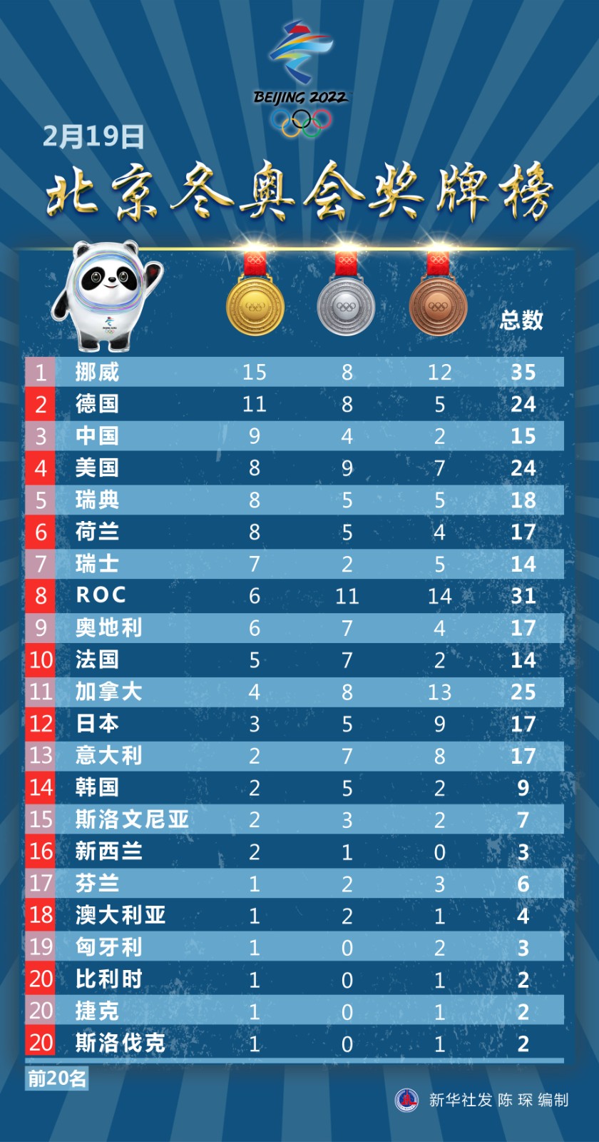 圖表:2月19日北京冬奧會獎牌榜