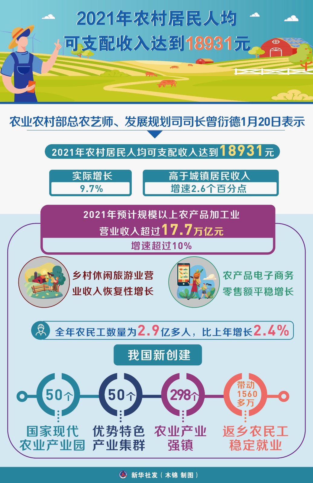 農(nóng)業(yè)農(nóng)村部總農(nóng)藝師、發(fā)展規(guī)劃司司長(zhǎng)曾衍德1月20日表示,2021年農(nóng)村居民人均可支配收入達(dá)到18931元,實(shí)際增長(zhǎng)9.7%,高于城鎮(zhèn)居民收入增速2.6個(gè)百分點(diǎn)。