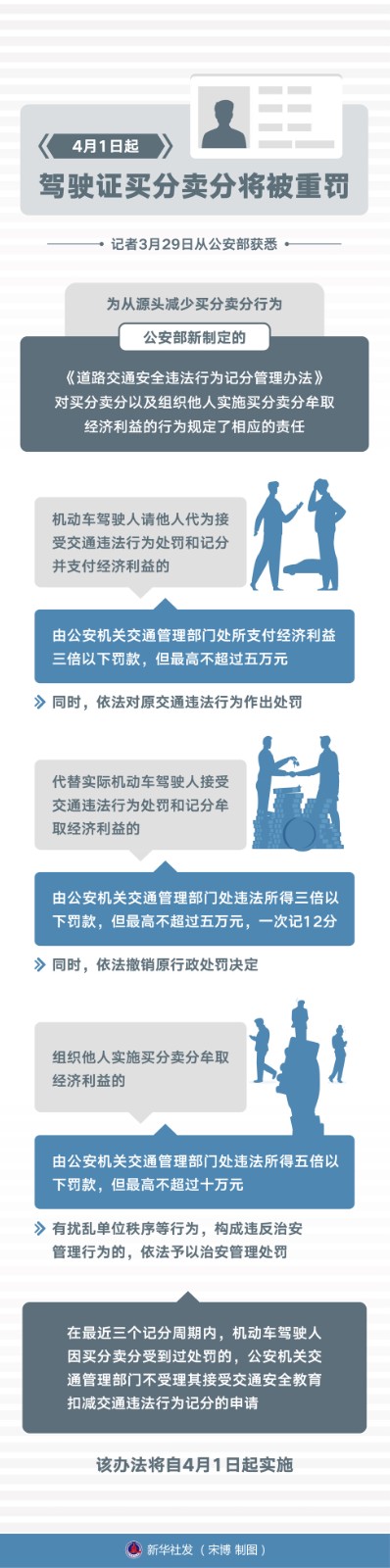 記者3月29日從公安部獲悉,為從源頭減少買分賣分行為,公安部新制定的《道路交通安全違法行為記分管理辦法》對買分賣分以及組織他人實施買分賣分牟取經濟利益的行為規(guī)定了相應的責任。該辦法將自4月1日起實施。