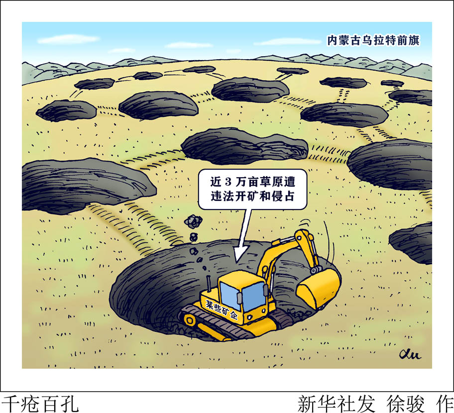 “新華視點”記者日前跟隨中央第三生態(tài)環(huán)境保護督察組督察發(fā)現(xiàn),內(nèi)蒙古自治區(qū)巴彥淖爾市烏拉特前旗礦山開采長期無序發(fā)展,近3萬畝草原遭違法開礦和侵占,使原本生態(tài)就脆弱的荒漠半荒漠草原遭受嚴重破壞。