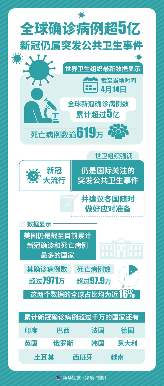 世界衛(wèi)生組織最新數(shù)據(jù)顯示,截至4月14日全球新冠確診病例數(shù)累計超過5億,死亡病例數(shù)逾619萬。雖然全球新增確診和死亡病例數(shù)近期持續(xù)下降,但世衛(wèi)組織強調(diào),新冠大流行仍是國際關(guān)注的突發(fā)公共衛(wèi)生事件,并建議各國隨時做好應(yīng)對準備。