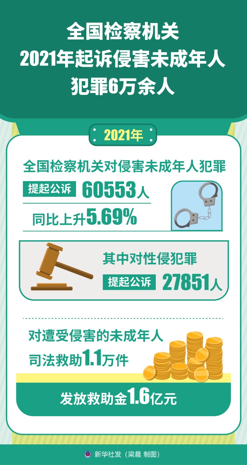 2021年,全國檢察機關(guān)對侵害未成年人犯罪提起公訴60553人,同比上升5.69%,其中對性侵犯罪提起公訴27851人。