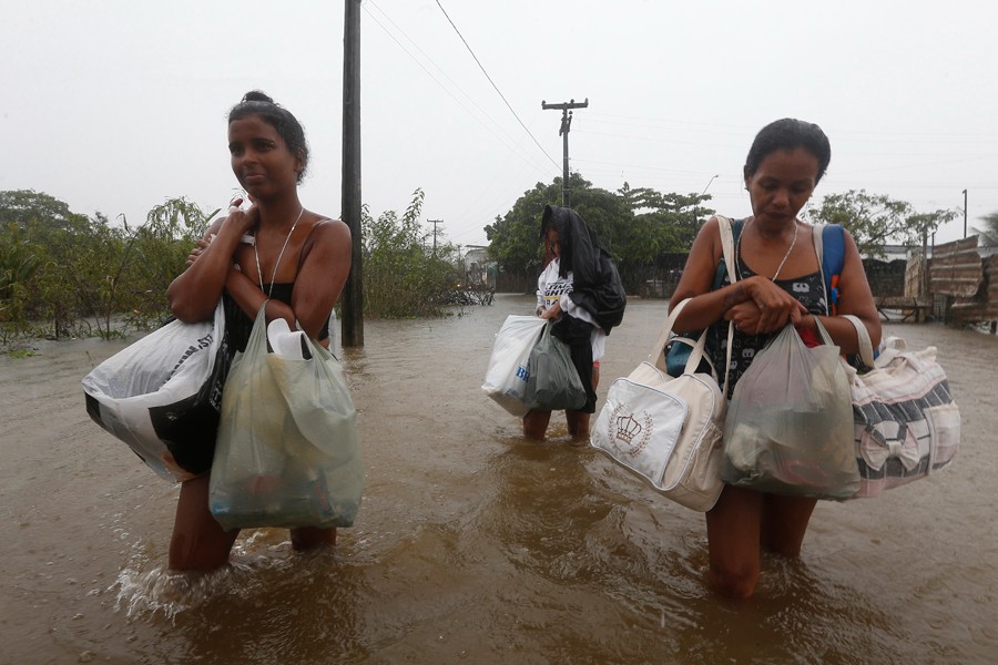 6月4日,人們走在巴西累西腓大都市區(qū)穆里貝卡鎮(zhèn)被洪水淹沒(méi)的街道上。