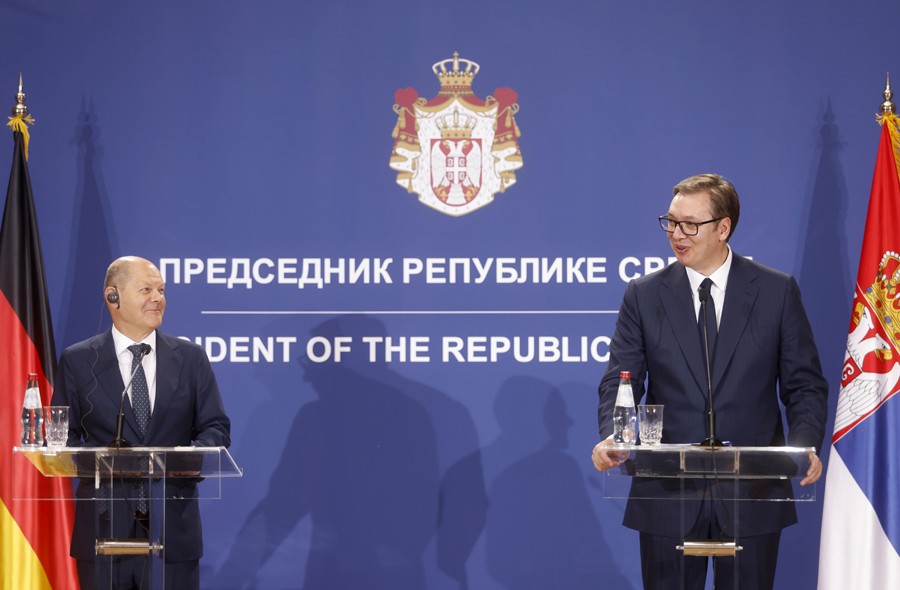 6月10日,塞爾維亞總統(tǒng)武契奇(右)在首都貝爾格萊德與到訪的德國(guó)總理朔爾茨出席新聞發(fā)布會(huì)。