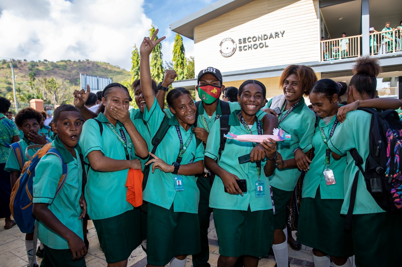 6月3日,在巴布亞新幾內(nèi)亞首都莫爾茲比港的布圖卡學園,學生們展示紙質(zhì)龍舟模型。