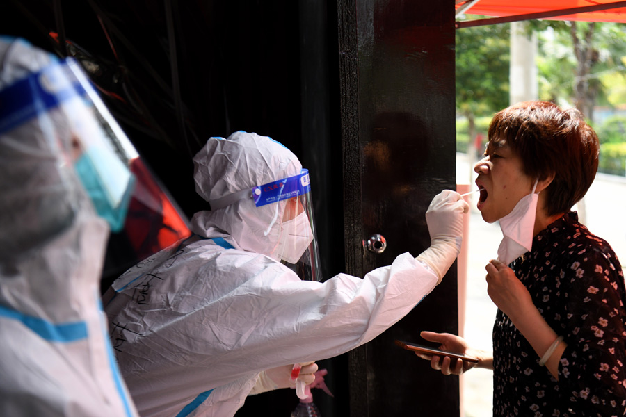 7月3日,在安徽省宿州市泗縣虹城街道東關社區(qū),醫(yī)務人員為居民進行核酸采樣。