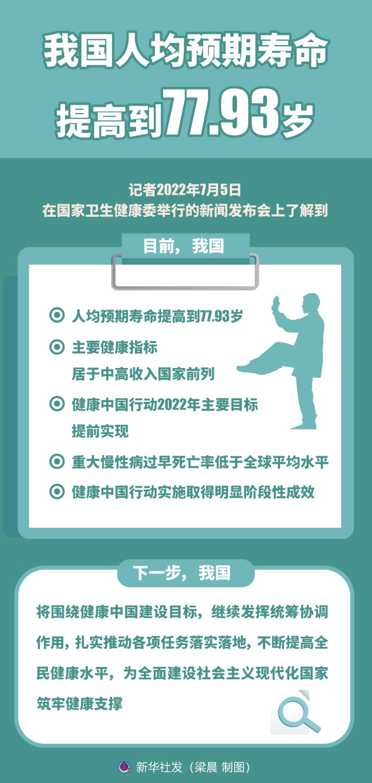 目前,我國人均預(yù)期壽命提高到77.93歲,主要健康指標居于中高收入國家前列,健康中國行動2022年主要目標提前實現(xiàn),重大慢性病過早死亡率低于全球平均水平,健康中國行動實施取得明顯階段性成效。