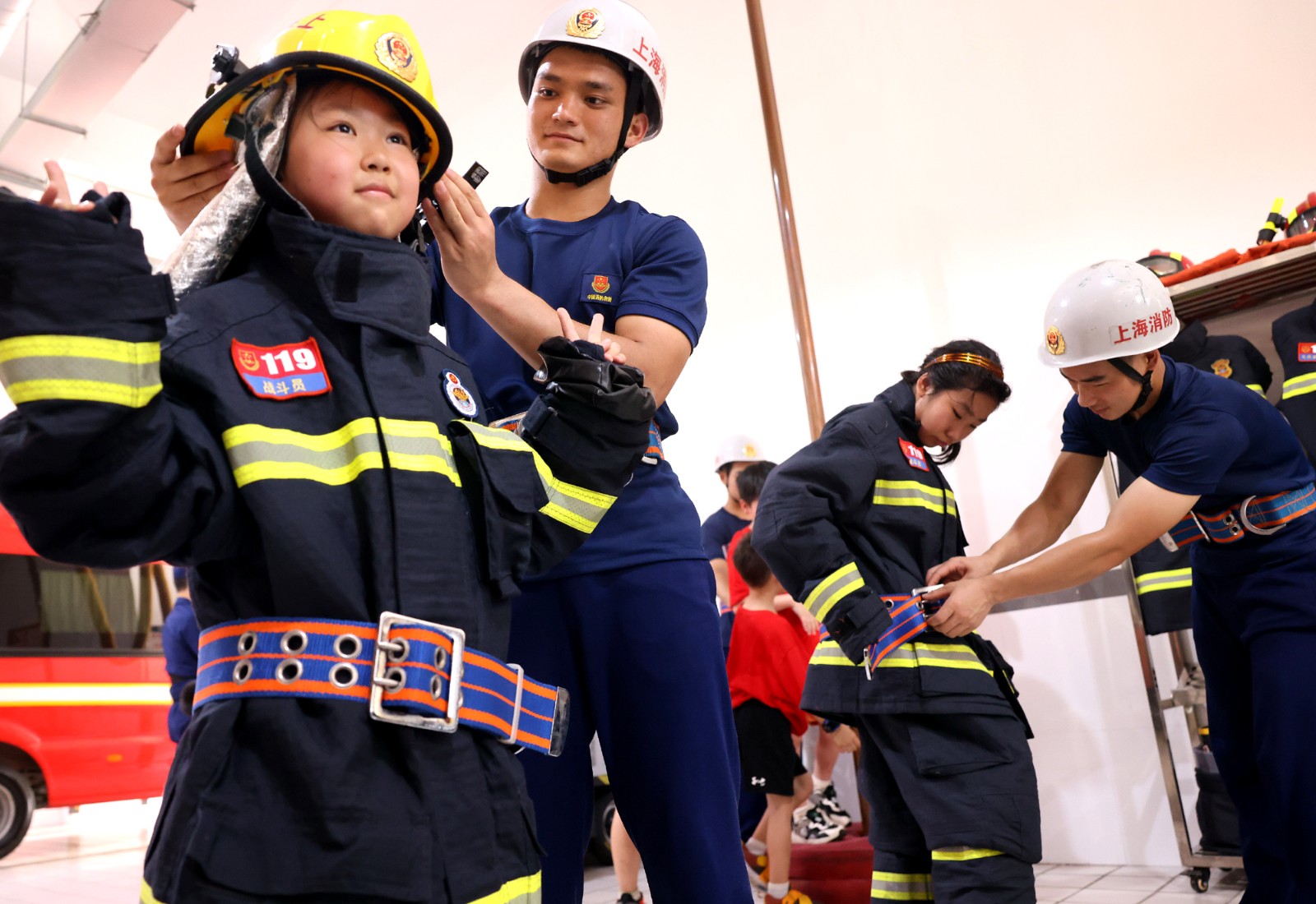 7月5日,消防員協(xié)助小學(xué)生穿戴消防戰(zhàn)斗服。