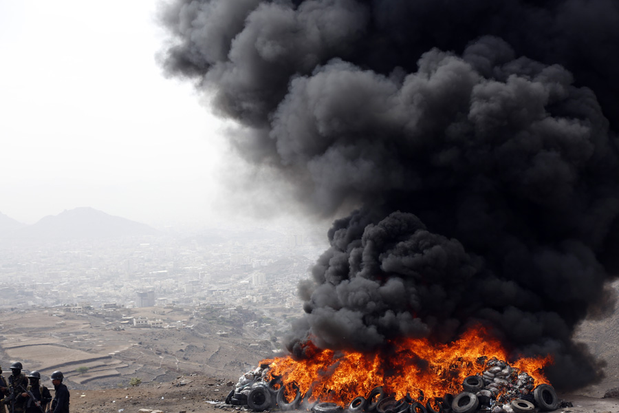 這是6月26日在也門(mén)薩那拍攝的毒品銷毀現(xiàn)場(chǎng)。