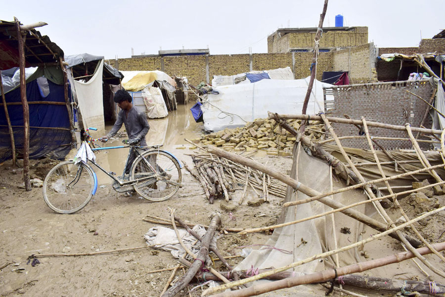 7月5日,在巴基斯坦奎達,一名男子從被暴雨損毀的自家房屋中收拾物品。