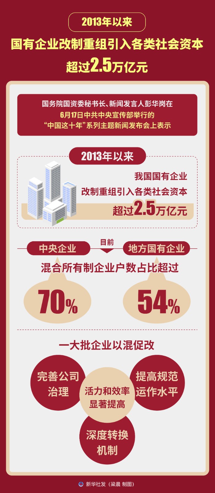 2013年以來,我國國有企業(yè)改制重組引入各類社會資本超過2.5萬億元,目前中央企業(yè)和地方國有企業(yè)中混合所有制企業(yè)戶數(shù)占比分別超過70%和54%。一大批企業(yè)以混促改,完善公司治理,提高規(guī)范運作水平,深度轉換機制,活力和效率顯著提高。