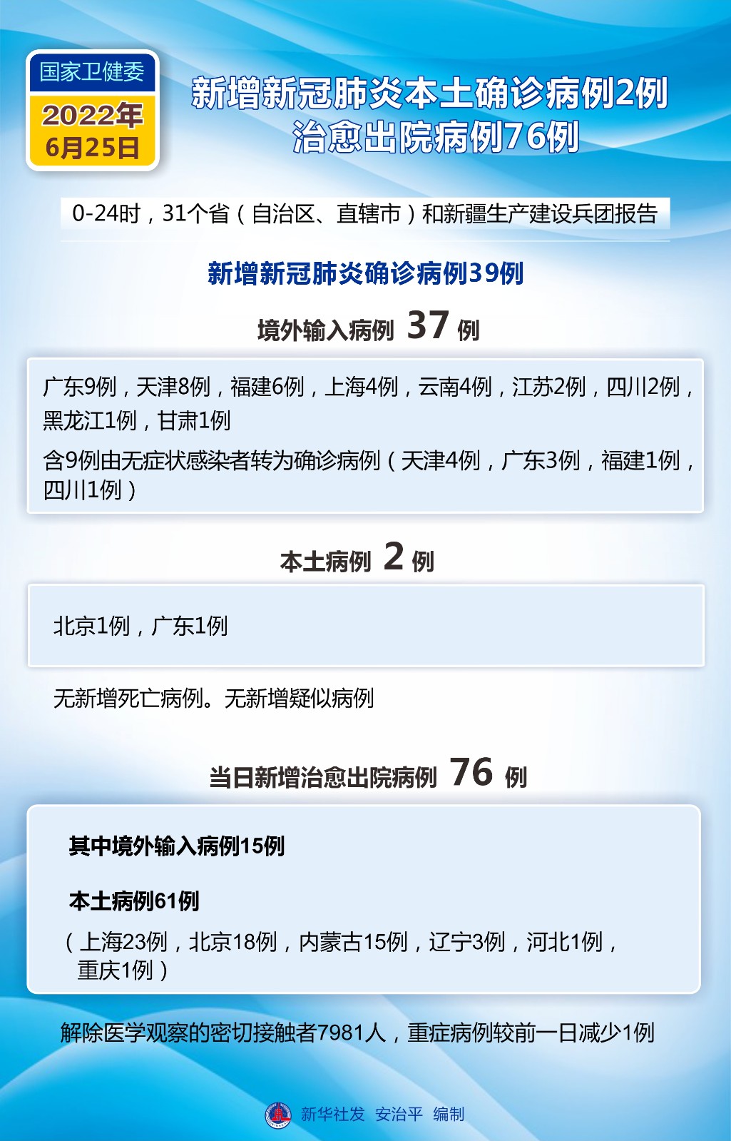 圖表:國家衛(wèi)健委:6月25日新增新冠肺炎本土確診病例2例 治愈出院病例76例