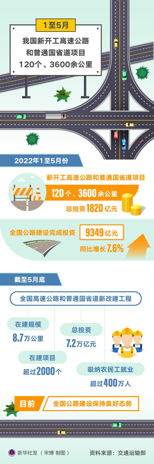 “今年1至5月份,新開(kāi)工高速公路和普通國(guó)省道項(xiàng)目120個(gè)、3600余公里,總投資1820億元?!苯煌ㄟ\(yùn)輸部副部長(zhǎng)趙沖久說(shuō)。