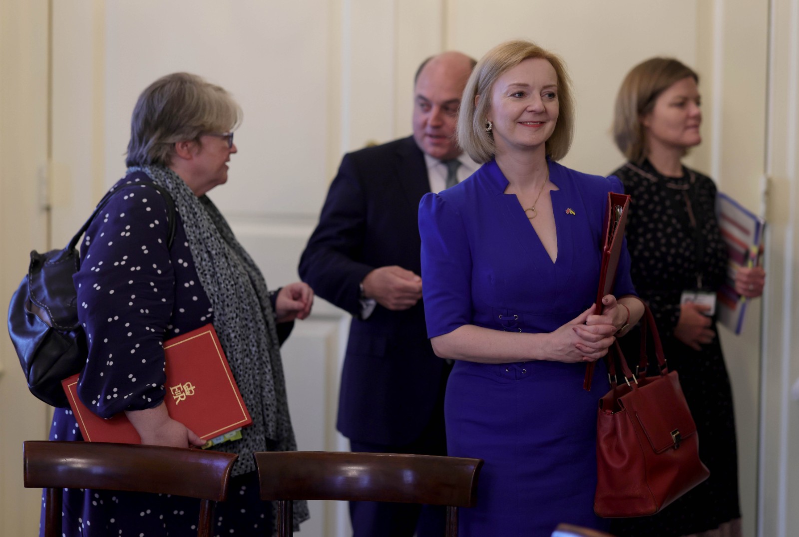 這是伊麗莎白·特拉斯(右二)在英國倫敦首相府參加內(nèi)閣會(huì)議后離開的資料照片(7月12日攝)。