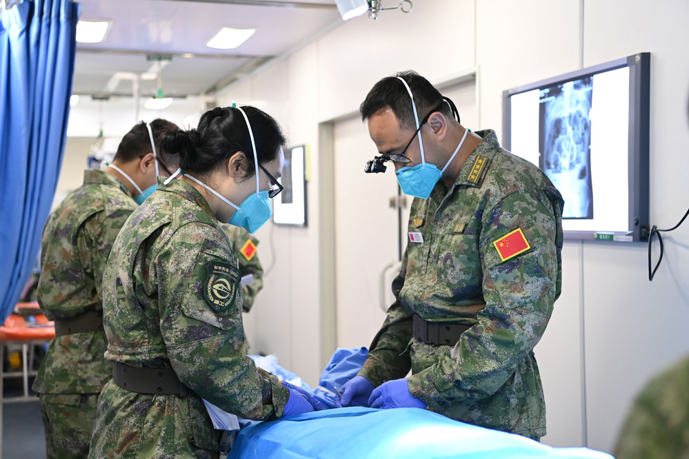 7月22日,手術組醫(yī)護人員在衛(wèi)生列車手術車廂內準備進行手術演練。