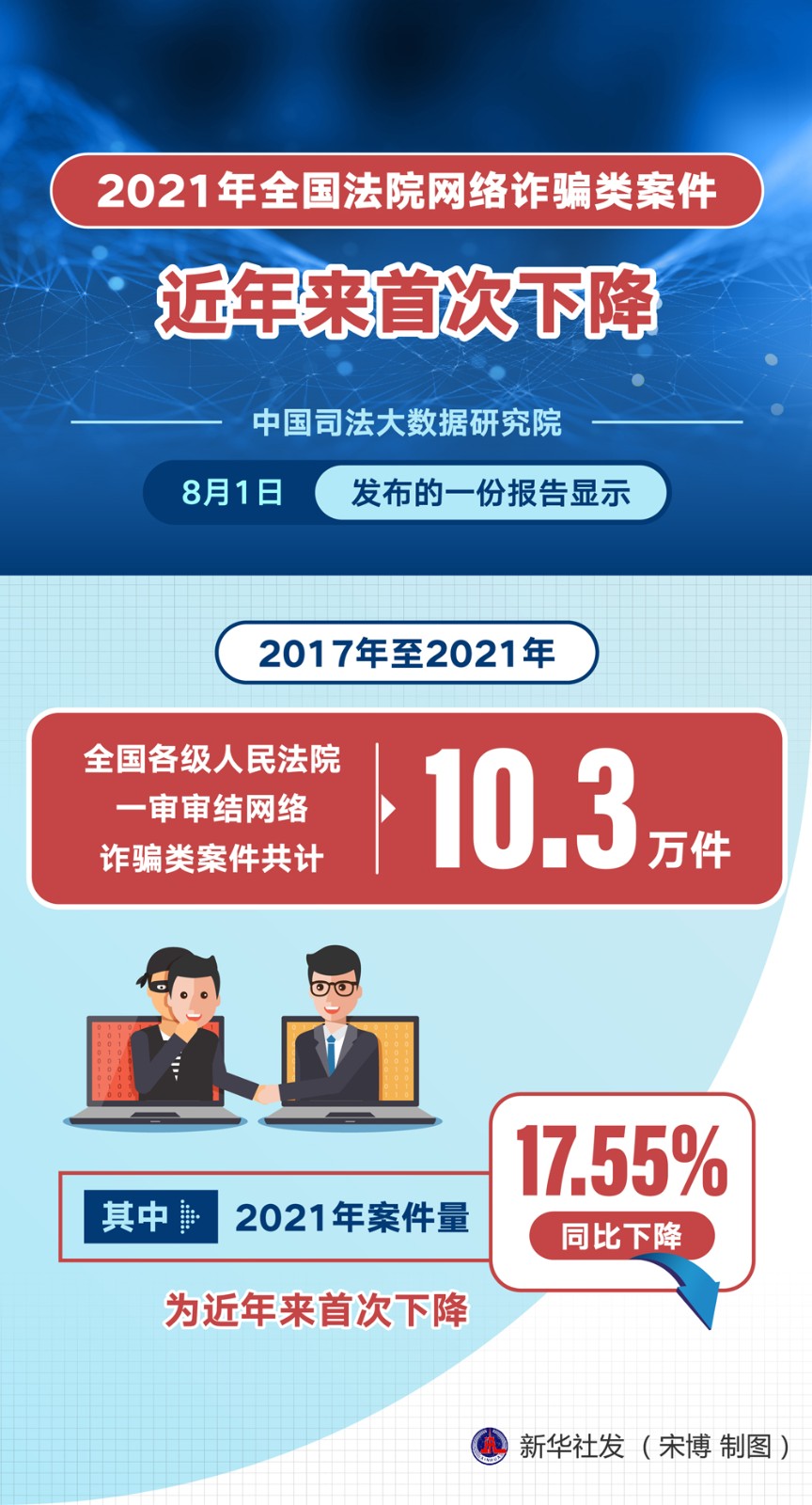 中國司法大數據研究院8月1日發(fā)布的一份報告顯示,2017年至2021年全國各級人民法院一審審結網絡詐騙類案件共計10.3萬件,其中2021年案件量同比下降17.55%,為近年來首次下降。