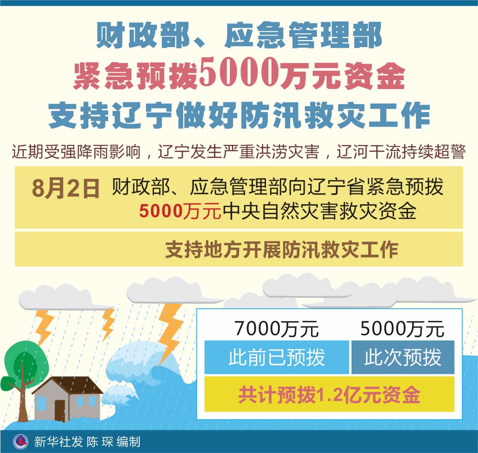 近期受強(qiáng)降雨影響,遼寧發(fā)生嚴(yán)重洪澇災(zāi)害,遼河干流持續(xù)超警。8月2日,財(cái)政部、應(yīng)急管理部向遼寧省緊急預(yù)撥5000萬(wàn)元中央自然災(zāi)害救災(zāi)資金,支持地方開(kāi)展防汛救災(zāi)工作。此前,財(cái)政部、應(yīng)急管理部已預(yù)撥遼寧省7000萬(wàn)元防汛抗旱補(bǔ)助資金,加上此次預(yù)撥的5000萬(wàn)元,共計(jì)預(yù)撥1.2億元資金。