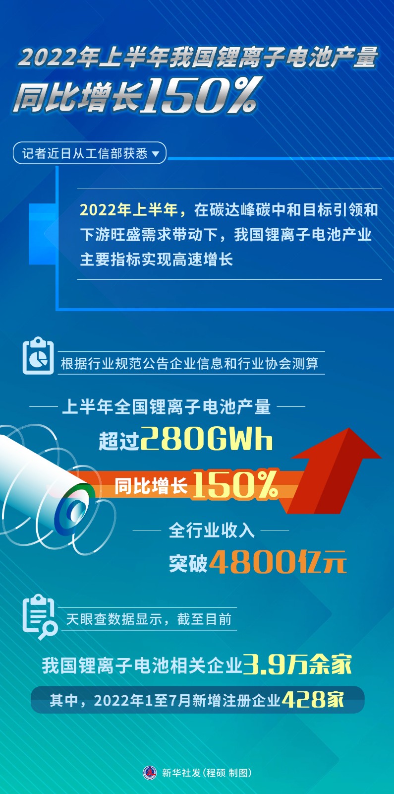 記者近日從工信部獲悉,2022年上半年,在碳達峰碳中和目標引領(lǐng)和下游旺盛需求帶動下,我國鋰離子電池產(chǎn)業(yè)主要指標實現(xiàn)高速增長。