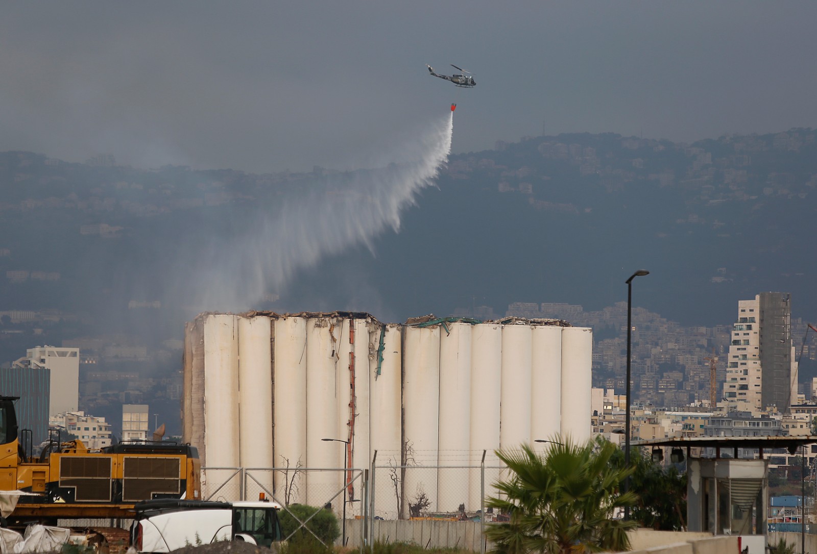 7月31日,在黎巴嫩貝魯特港口,直升機向部分坍塌的港口糧倉灑水。