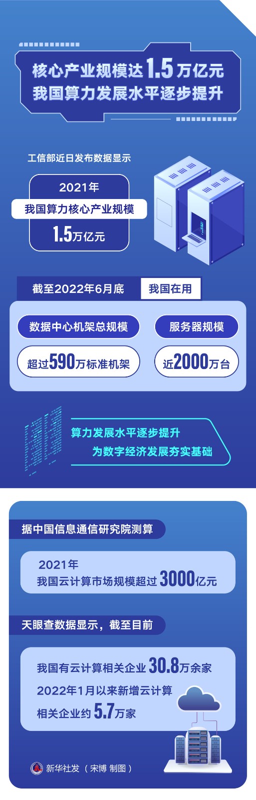 工信部近日發(fā)布數(shù)據(jù)顯示,2021年,我國算力核心產(chǎn)業(yè)規(guī)模達(dá)1.5萬億元。截至2022年6月底,我國在用數(shù)據(jù)中心機(jī)架總規(guī)模超過590萬標(biāo)準(zhǔn)機(jī)架,服務(wù)器規(guī)模近2000萬臺。算力發(fā)展水平逐步提升,為數(shù)字經(jīng)濟(jì)發(fā)展夯實(shí)基礎(chǔ)。