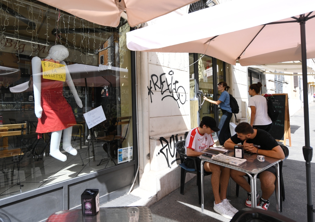 近日,意大利羅馬一家餐館的玻璃窗上懸掛著一個充氣人偶,它身前的紙牌上寫著醒目的“賬單已到!”字樣,吸引著人們的目光。這家餐館的經(jīng)營者勞拉·拉莫尼說,此舉的起因是餐館近期面臨的高額電費(fèi)賬單。今年6月和7月,餐館的電費(fèi)賬單共計約2600歐元,而去年同期約為900歐元。勞拉表示賬單令她不堪重負(fù),為了維持經(jīng)營,她不得不辭去兩名員工,上調(diào)部分商品價格,并申請分期支付賬單。