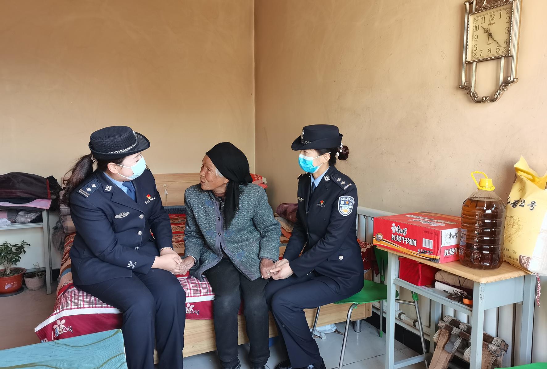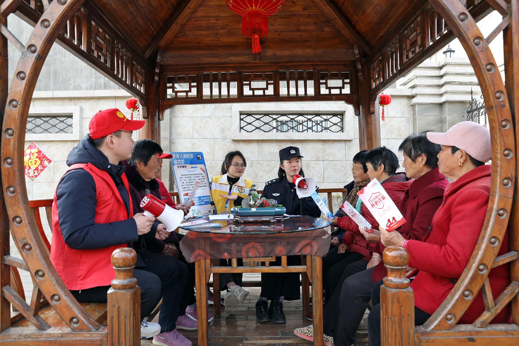 圖為社區(qū)民警和網(wǎng)格員向留守老人宣傳防范養(yǎng)老詐騙知識。