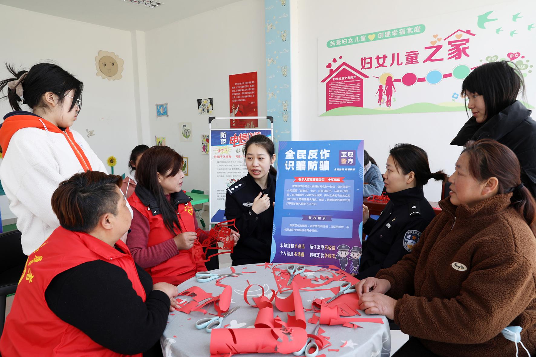 3月7日,江蘇省寶應縣公安局女民警在新豐村婦女兒童之家宣傳反家庭暴力法及反詐知識。
